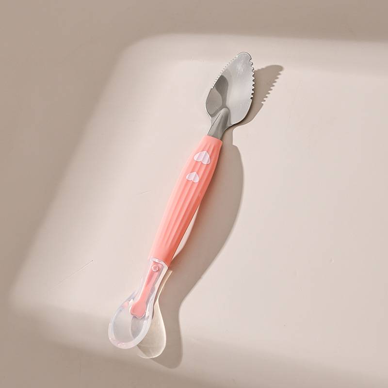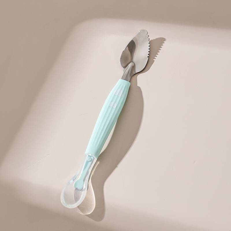 যেসব মায়েরা বাচ্চাদের সলিড খাওয়ানো শুরু করেছেন তাদের জন্য খুবই গুরুত্বপূর্ণ একটা চামুচ। এর একপাশে আছে সিলিকন চামচ এবং অন্য পাশে স্টিলের। স্টিলের অংশ দিয়ে যেমন শক্ত ফলের খোসা ছাড়ানো যায় তেমনি ফল কে আঁচড়িয়ে নরম করে বেবী কে খাওয়ানো যায় সহজেই। আবার সিলিকন অংশ দিয়ে খাবার সুন্দরভাবে তুলে বেবিকে খাওয়াতে পারবেন